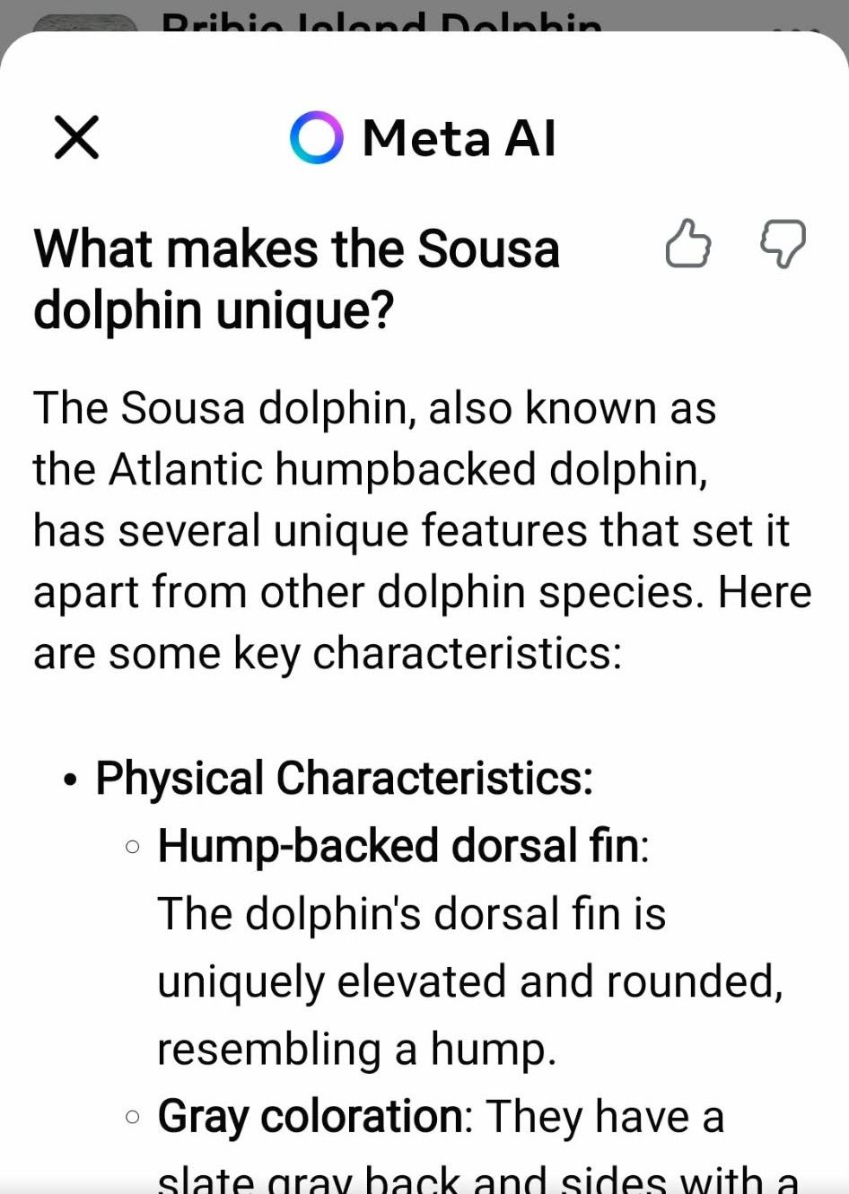 I had a recent AI summary of Australian humpback dolphins on a post shared on a humble Facebook group I admin for citizen scientists on Bribie Island, Australia. Summarising Australian humpback dolphins (Sousa sahulensis) it presented the reader with an account of Atlantic humpback dolphins (S. teuszii) from half a world away.